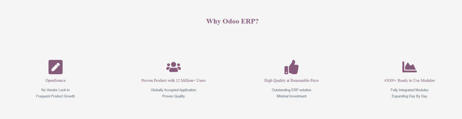 Odoo integrates key business functions such as Manufacturing, Finance & Accounting, Procurement, Sales, Inventory Management, Customer Relationship Management (CRM), Human Resources, Point of Sale, E-commerce & Website Management, Project Management, and Document Management—all within a single, seamless platform.